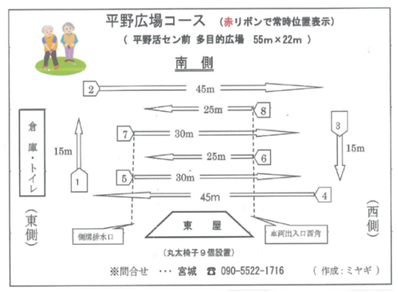 練習会では (1)外側ホールは右回り、内側ホールは左回りに設置 (2)赤リボンで常時位置表示 (3)当番は月ごとに (4)一組の人数は4人~3人 (5)組分けと打順はクジで (6)開始前に準備体操、 (7)終了後は5位までを発表 (8)当番表, 連絡網,コース図、クラブ案内、会員名簿、出席表、スコア表、市文書等を毎回、会場に掲出しています。
